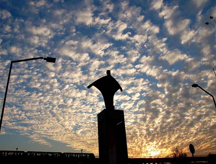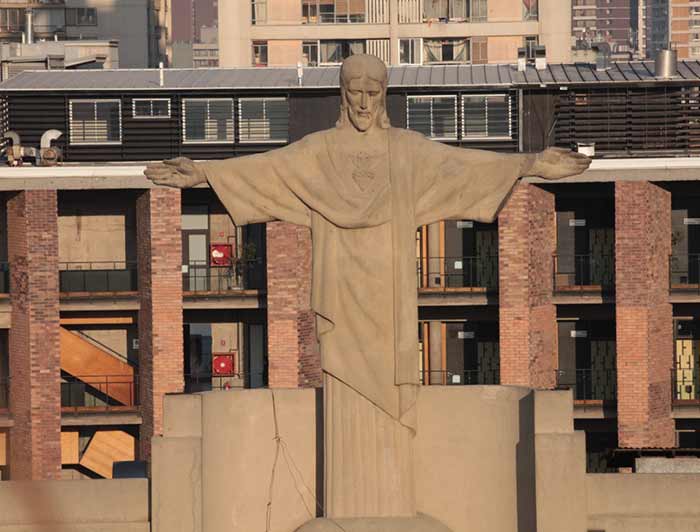 El Cristo que recibe a la comunidad de la UC en el campus San Joaquín fue obra del escultor Hernán Puelma. Se trata de una escultura forjada en bronce de 500 x 300 x 100 centímetros.