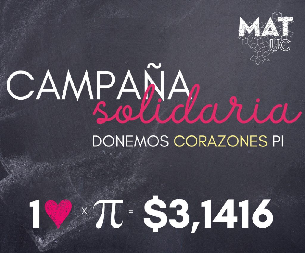 Desde la Facultad de Matemáticas también se han hecho parte con un llamado muy especial a donar “Corazones Pi”. Esto quiere decir que cada persona puede donar una cantidad de corazones que se multipliquen por el equivalente al número Pi en dinero. Estas donaciones en dinero se descuentan por medio de la liquidación de sueldo y van en beneficio de familias de la Parroquia Jesús Señor de la Vida y de personas en situación de calle de la población La Bandera, ambos en San Ramón.