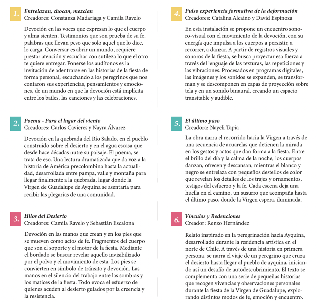 La Residencia Artística fue un proyecto de investigación y creación que convocó a estudiantes de arte, arquitectura, música, teatro, humanidades y teología para vivir y reflexionar en torno a una de las celebraciones religiosas más significativas del norte de Chile: la Fiesta de la Virgen de Guadalupe de Ayquina.