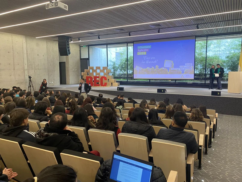 “La pandemia, la historia de vida de este país, nos enseña que tenemos que colaborar entre todos, que no hay ningún colegio o liceo tan pequeño que no pueda entregar un aporte, ni uno tan grande que tenga todo al interior de sus respectivas pastorales”, dijo el Rector, Ignacio Sánchez durante la presentación del encuentro ante los estudiantes y profesores que llenaron el auditorio Francisco Rosende de la Facultad de Ciencias Económicas y Administrativas.